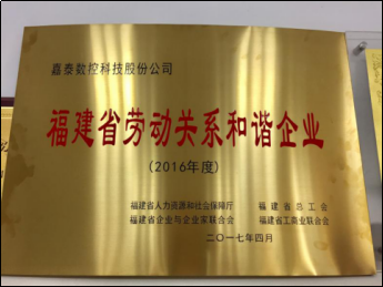 | 嘉泰數(shù)控:被授予“福建省勞動關(guān)系和諧企業(yè)”榮譽稱號 |