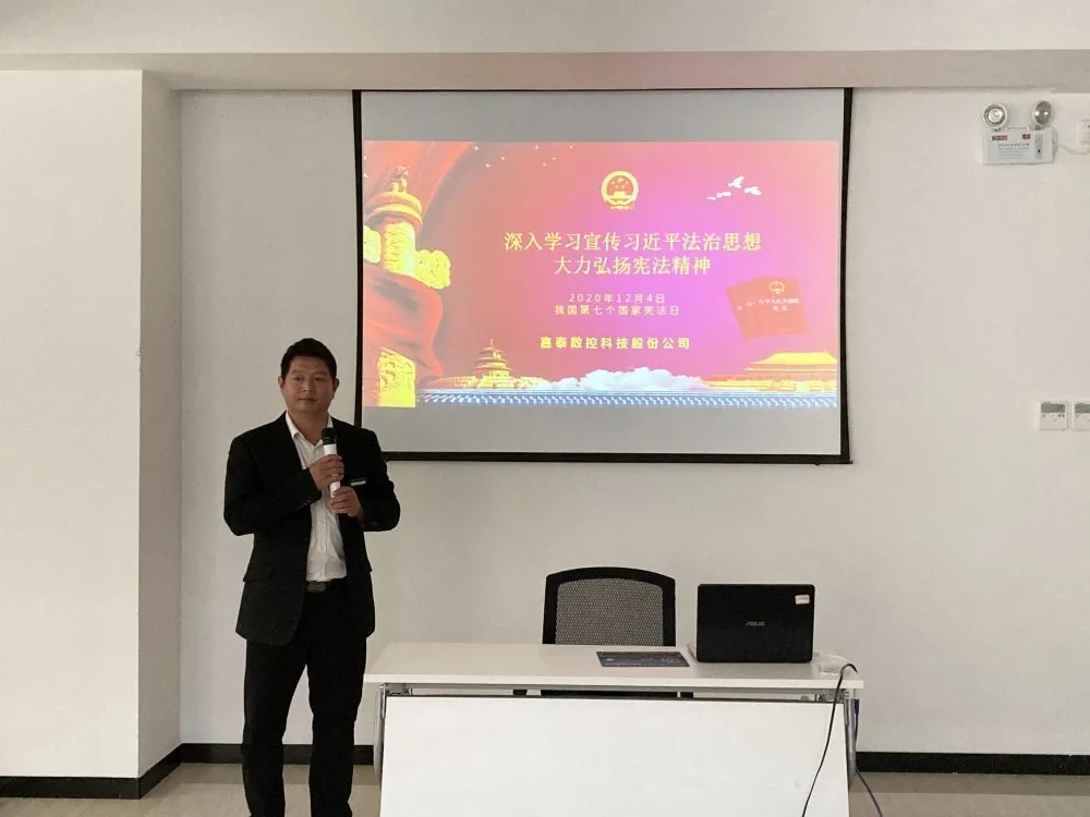 國家憲法日 2020年12月4日,是第七個(gè)憲法宣傳日也是第三個(gè)“憲法宣傳周”。為了深入學(xué)習(xí)宣傳貫徹黨的十九大精神,營造全民學(xué)習(xí)憲法、宣傳憲法、遵守憲法、維護(hù)憲法的良好氛圍,2020年11月30日-12月6日,嘉泰數(shù)控組織開展“12·4”國家憲法日暨憲法宣傳周活動(dòng)。 今年宣傳周主題為“深入學(xué)習(xí)宣傳習(xí)近平法治思想 大力弘揚(yáng)憲法精神”,為積極營造憲法學(xué)的良好氛圍,嘉泰數(shù)控在廠區(qū)內(nèi)懸掛憲法宣傳標(biāo)語橫幅,向員工發(fā)放憲法知識(shí)傳單,組織觀看憲法宣傳片,組織員工集體參與憲法培訓(xùn)課程,積極傳播憲法知識(shí),弘揚(yáng)憲法精神。此次活動(dòng)的開展,進(jìn)一步引導(dǎo)嘉泰員工樹立法治意識(shí),凝聚法治正能量,傳播法治精神,把法治宣傳教育融入生活,切實(shí)提高廣大群眾的憲法意識(shí)和法治觀念,形成人人學(xué)法、遵法、守法、用法的良好法治氛圍。