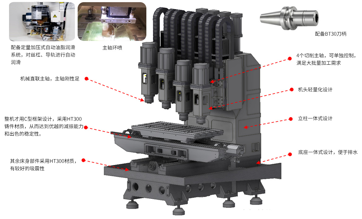 該系列產(chǎn)品主要針對2.5D、3D玻璃、的大面開粗加工,以及外輪廓加工,4個切削主軸設(shè)計,多通道可單獨控制主軸升降,并采用直聯(lián)機械主軸設(shè)計,主軸切削扭矩大,對于玻璃等脆硬材料的粗加工有很大優(yōu)勢。